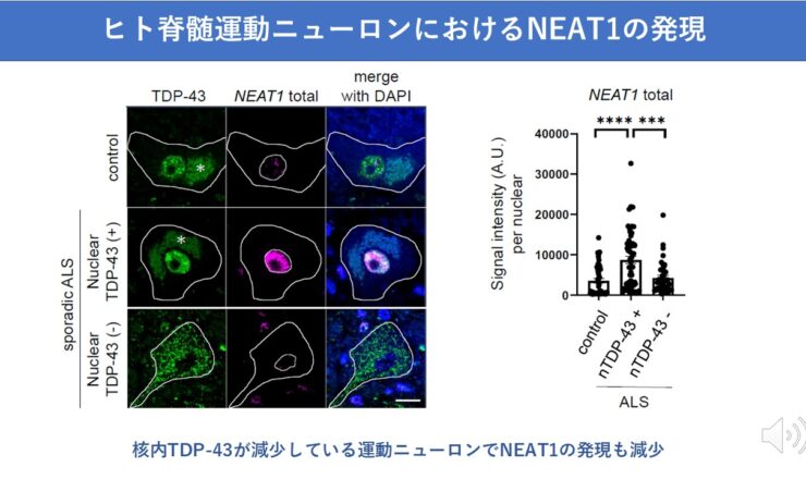 長鎖非翻訳RNAであるNEAT1の減少は筋萎縮性側索硬化症(ALS)病態を悪化させうる NEAT1の減少がALSの運動ニューロン変性を増悪させている...
