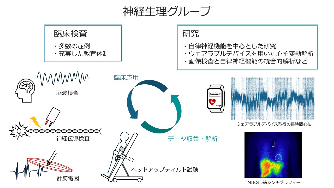 神経生理グループでは、病院における神経生理関連の臨床検査を担当するとともに、自律神経機能を中心とした研究を行っています。年間で神経伝導検査や針筋電図を約400件施行し、約350件の脳波ならびに約500件の神経生理検査の判読を行っています。さらに、医学科および検査学科の学生教育や関連病院の医師に対する研修にも対応しており、検査を通じて非常に多くの症例を学ぶ機会があります。